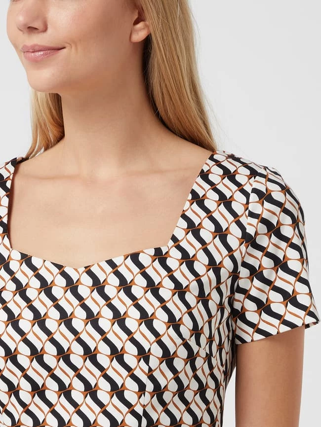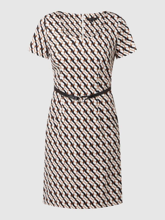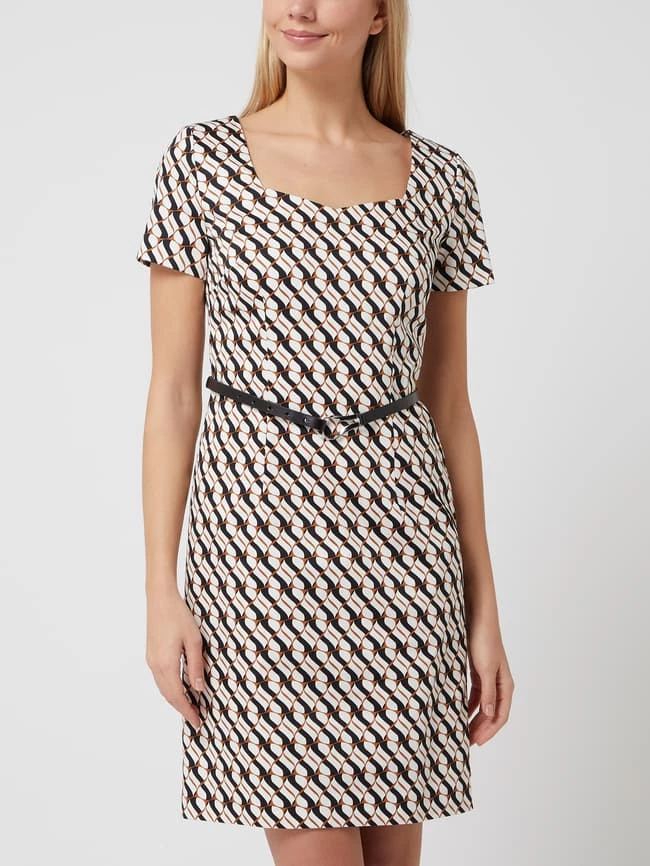 Das Kleid von comma ist aus einem Baumwoll-Elasthan-Mix gefertigt und eng anliegend geschnitten. Es kommt mit Allover-Muster, kurzen Ärmeln und Gürtel in Leder-Optik.