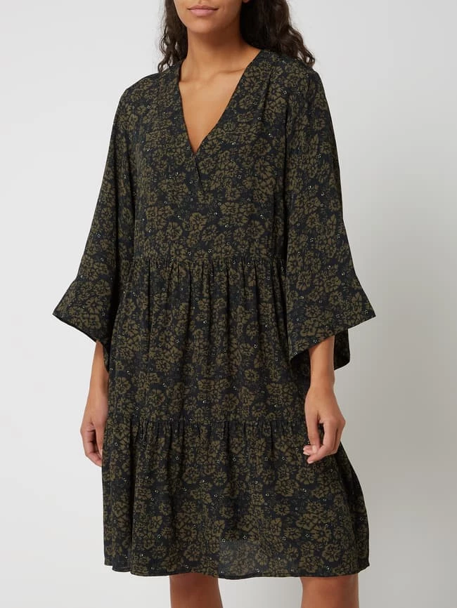 Das Kleid von ILSE JACOBSEN ist aus reiner Viskose gefertigt und ausgestellt geschnitten. Es kommt mit Allover-Muster, 3/4-Arm und Volantsaum.