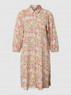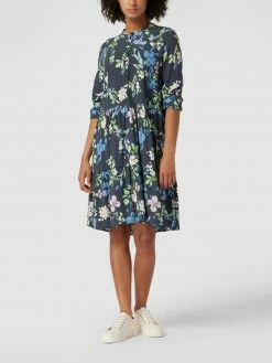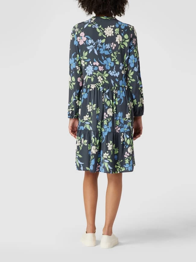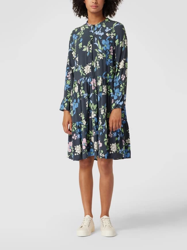 Das knielange Kleid von Jake*s Casual ist aus reiner Viskose gefertigt und in lockerer Passform gehalten. Es zeigt sich mit Allover-Muster, Serafino-Kragen, kurzer Knopfleiste sowie ausgestellter Rockpartie im Stufen-Look.
