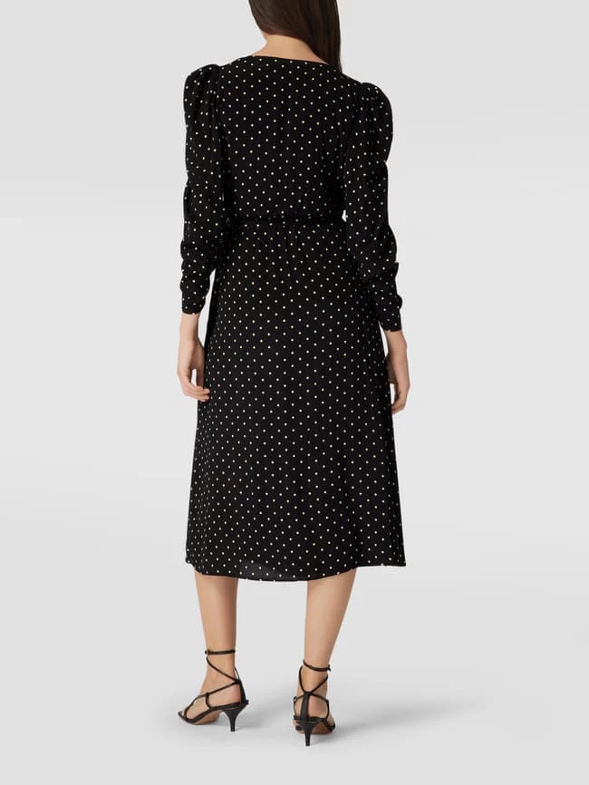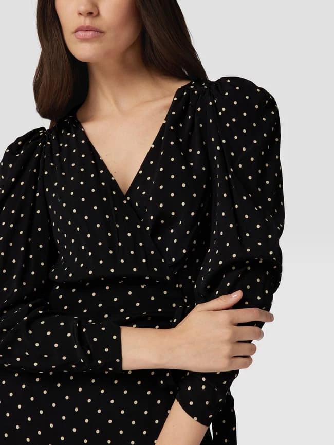 Das Wickelkleid von MANGO ist aus reiner Viskose gefertigt und leicht tailliert geschnitten. Es zeigt sich mit Polka Dots, Raffungen an den Ärmeln und V-Ausschnitt.