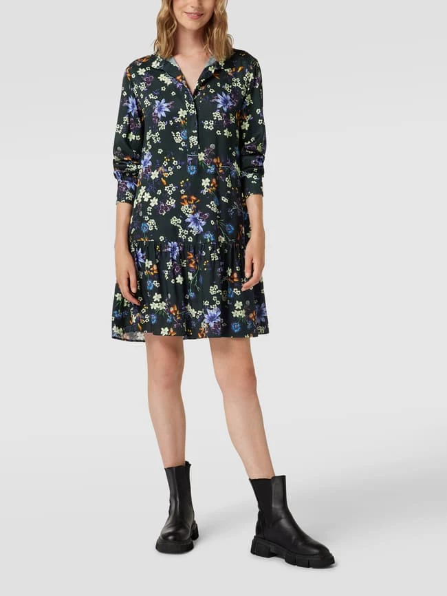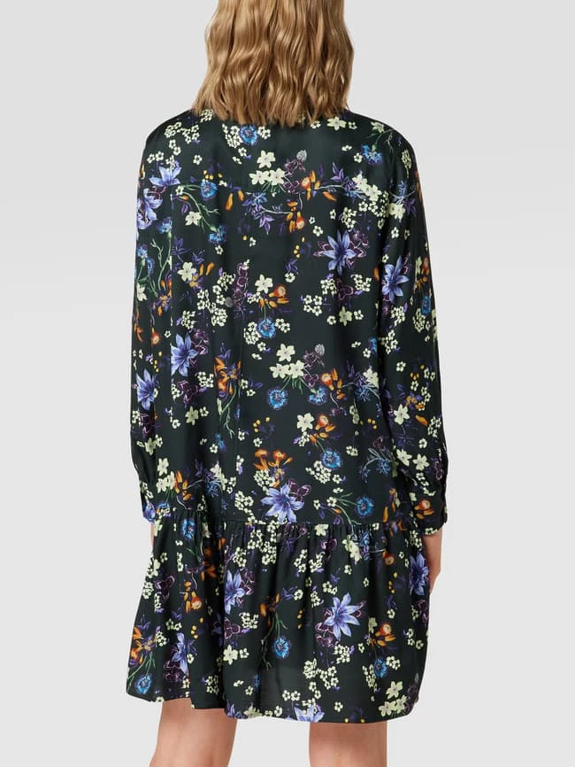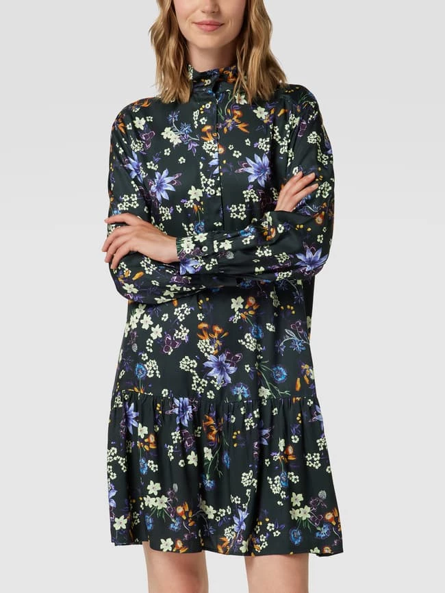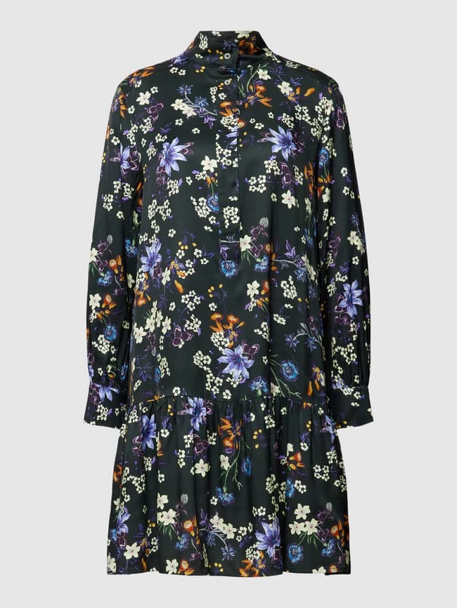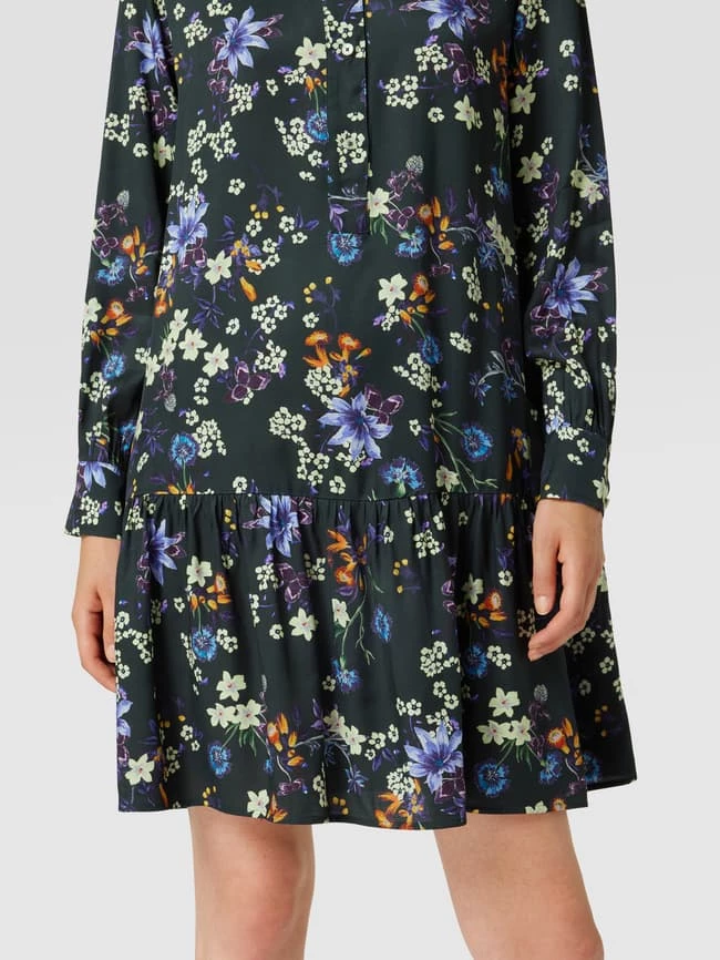 Das knielange Kleid von MARC O’POLO ist aus reiner Viskose gefertigt und locker geschnitten. Es kommt mit Allover-Muster, Stehkragen und halber Knopfleiste.