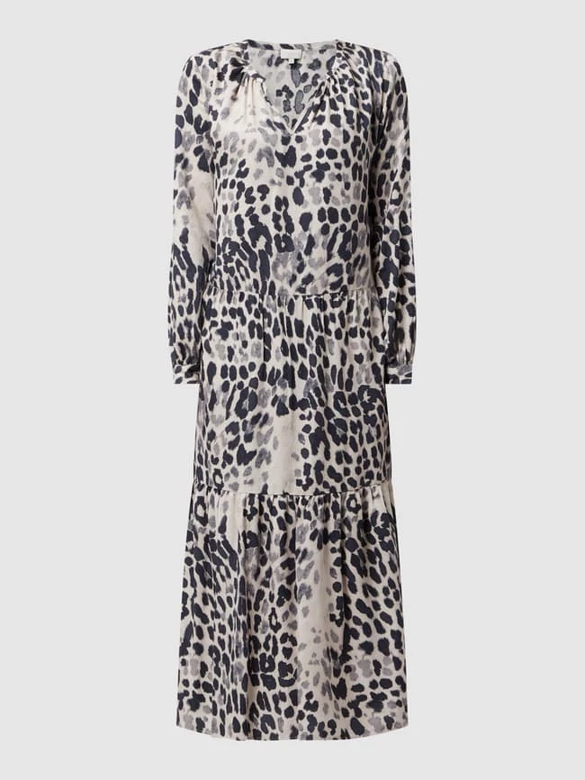 Das Midikleid von MILANO ITALY ist aus reiner Viskose gefertigt und ausgestellt geschnitten. Es zeigt sich mit Animal-Print, Tunikakragen und Eingrifftaschen.