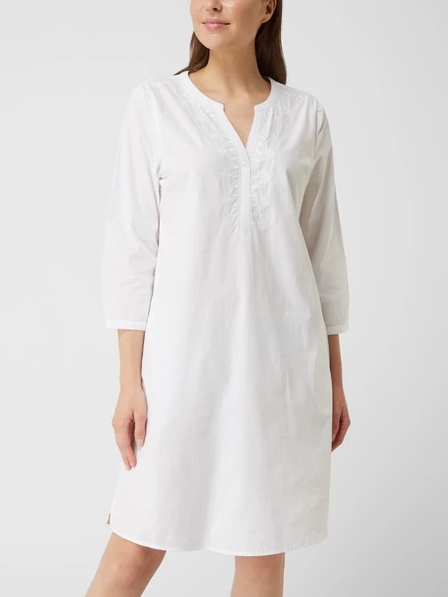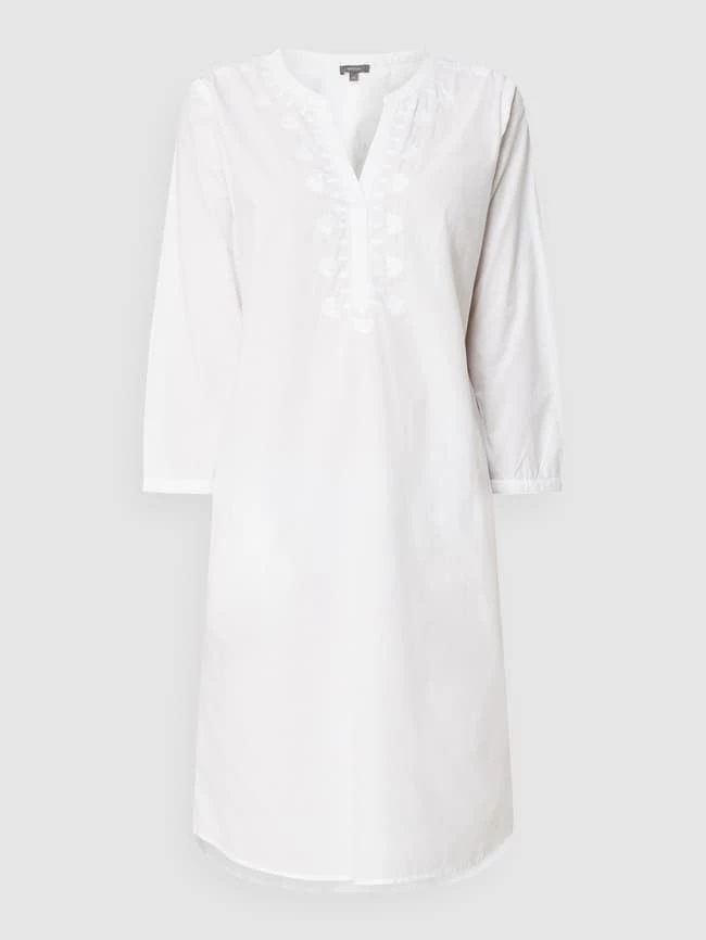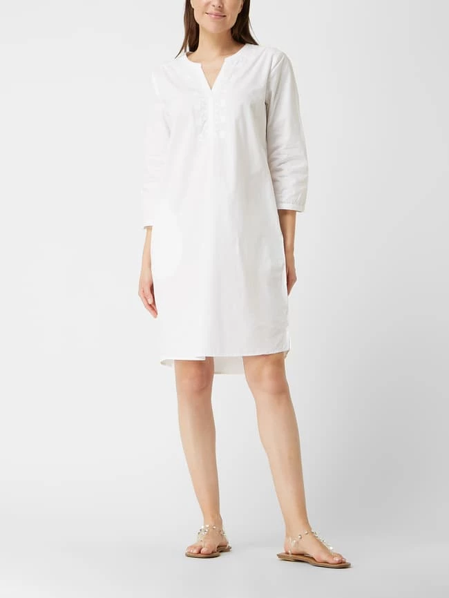 Das Kleid von MONTEGO ist aus reiner Baumwolle gefertigt und ausgestellt geschnitten. Es kommt in Knielänge, mit V-Ausschnitt, Stickereien, Sportmanschetten und abgerundetem Saum.