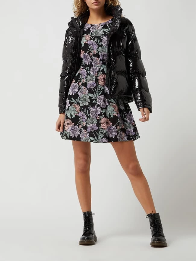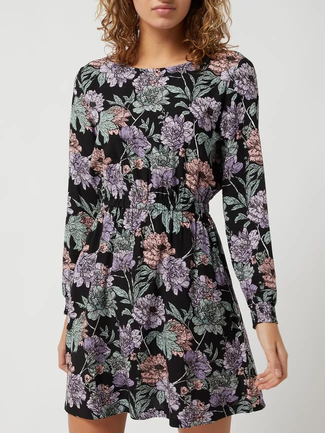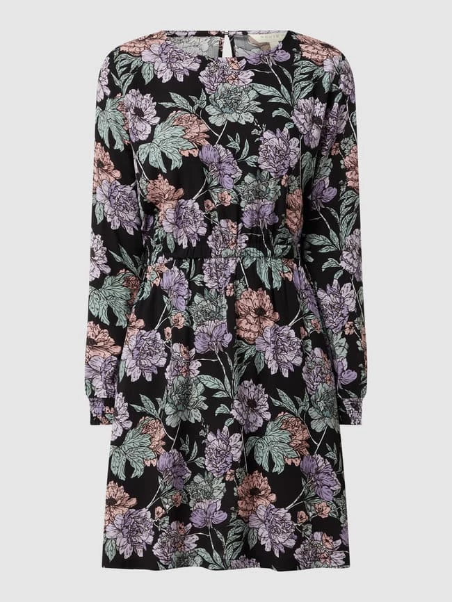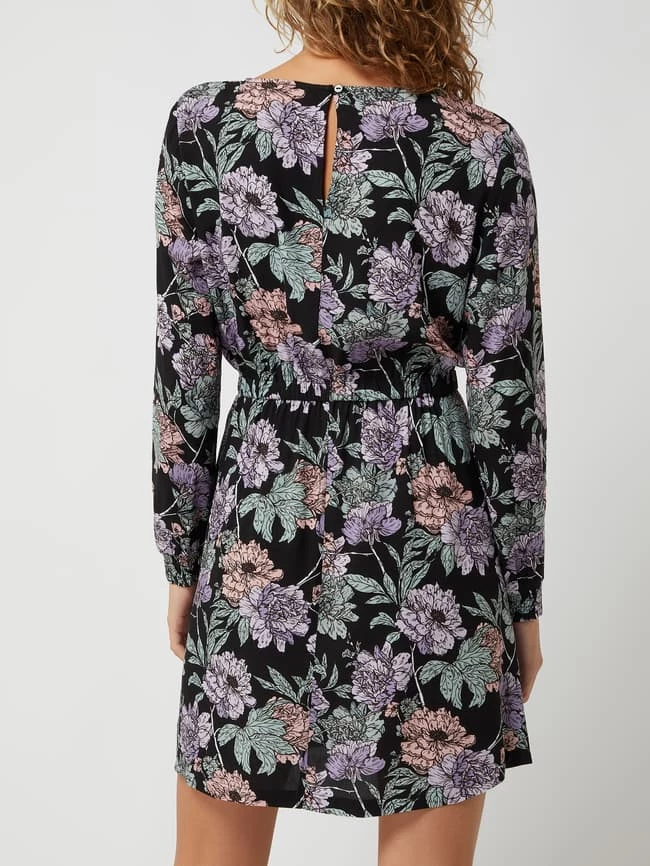 Das Kleid von REVIEW ist aus reiner Viskose gefertigt und tailliert geschnitten. Es zeigt sich mit floralem Muster, gesmokten Ärmelabschlüssen und Schlüsselloch-Ausschnitt auf der Rückseite.